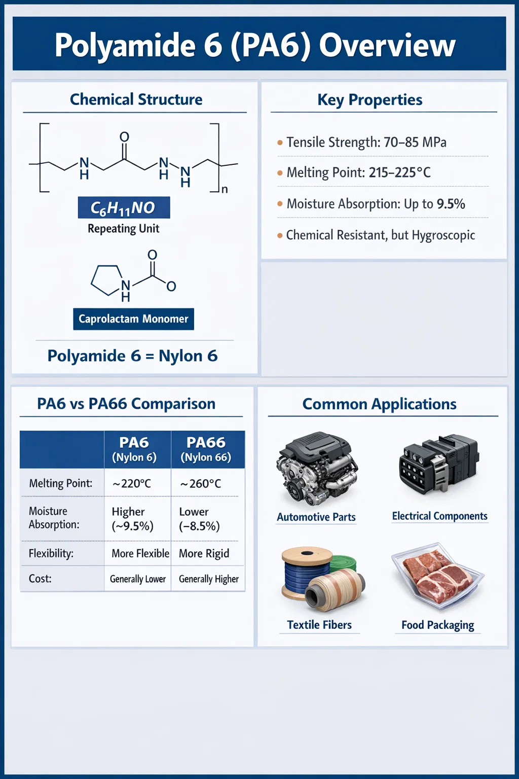 Weltweit ist Polyamid 6 einer der am häufigsten verwendeten technischen Thermoplaste. Jährliches Produktionsvolumen übersteigt 4 Millionen Tonnen , und das Material ist ein integraler Bestandteil von Industrien, die von der Automobil- und Elektronikindustrie bis hin zu Textilien und Lebensmittelverpackungen reichen. Zu verstehen, wofür PA6 steht, ist nur der Ausgangspunkt – seine Chemie, seine Leistungsmerkmale und sein Verarbeitungsverhalten bestimmen, warum es kommerziell so dominant geworden ist.