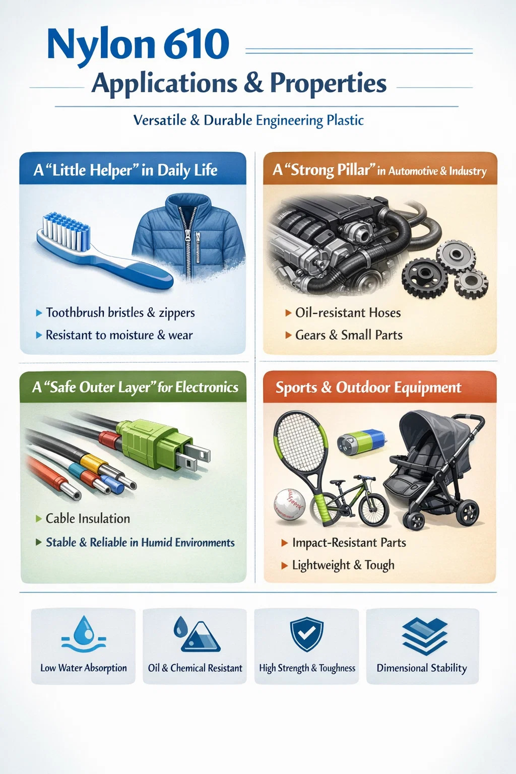 Bürsten und Fasern: Die Borsten Ihrer Zahnbürste und die Reißverschlüsse Ihrer Kleidung bestehen oft aus Nylon 610. Im Vergleich zu gewöhnlichem Nylon 6 Es funktioniert besser in feuchten Umgebungen, ist weniger anfällig für Wasseraufnahme und Verformung und die Borsten behalten auch nach längerem Gebrauch ihre Elastizität, sodass sie nicht weich und schlaff werden.