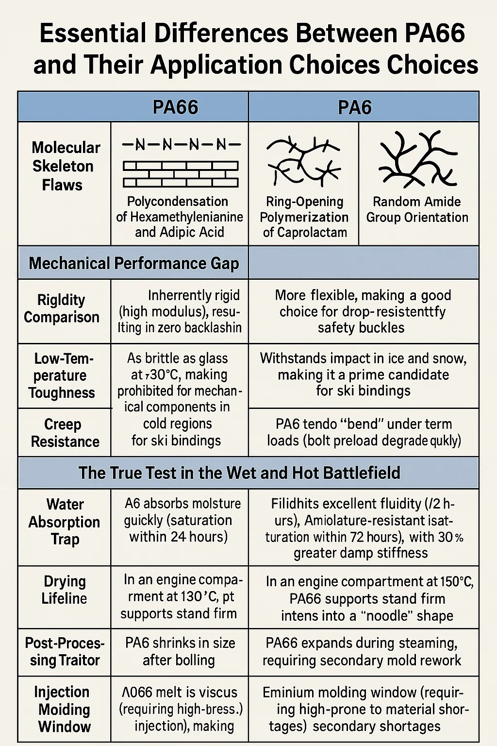 Low -Temperatur -Zähigkeit: PA66 ist ebenso spröde wie Glas bei -30 ° C, wodurch es für mechanische Komponenten in kalten Regionen verboten ist. PA6 hält den Einfluss auch bei Eis und Schnee aus und macht es zu einem Hauptkandidaten für Skibindungen.